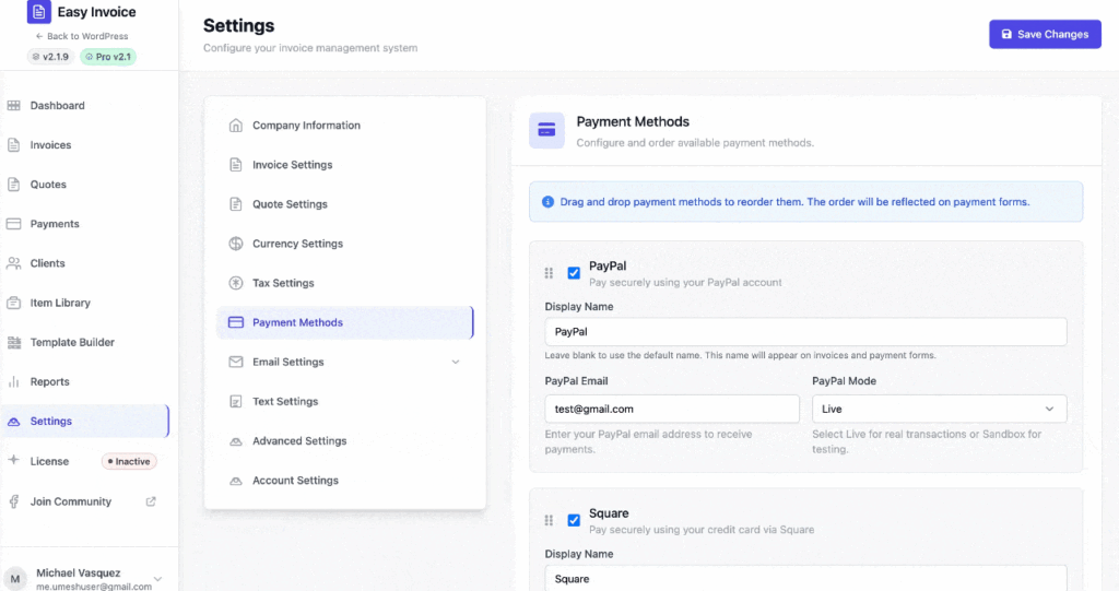 You can set up payment gateways from here for the Invoice, by default Easy Invoice Support PayPal payment gateway, and if you want to add other gateways you can use any of the payment extensions from our available extensions lists.